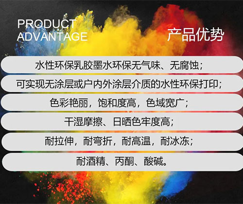 環(huán)保水性乳膠墨水綠色環(huán)保,無論是打印過程中,還是打印完成的成品,都沒有異味,有效提升產(chǎn)品環(huán)保品質(zhì),迎合市場需要;改善生產(chǎn)環(huán)境,降低用工風(fēng)險;沒有易燃耗材,降低生產(chǎn)消防風(fēng)險。適應(yīng)打印介質(zhì)的多樣性和成像持久性的的優(yōu)點(diǎn),尤其適合裝修裝飾、壁紙壁畫等環(huán)保要求極高的行業(yè)當(dāng)中,是一款代表未來打印噴墨方向的功能性墨水。