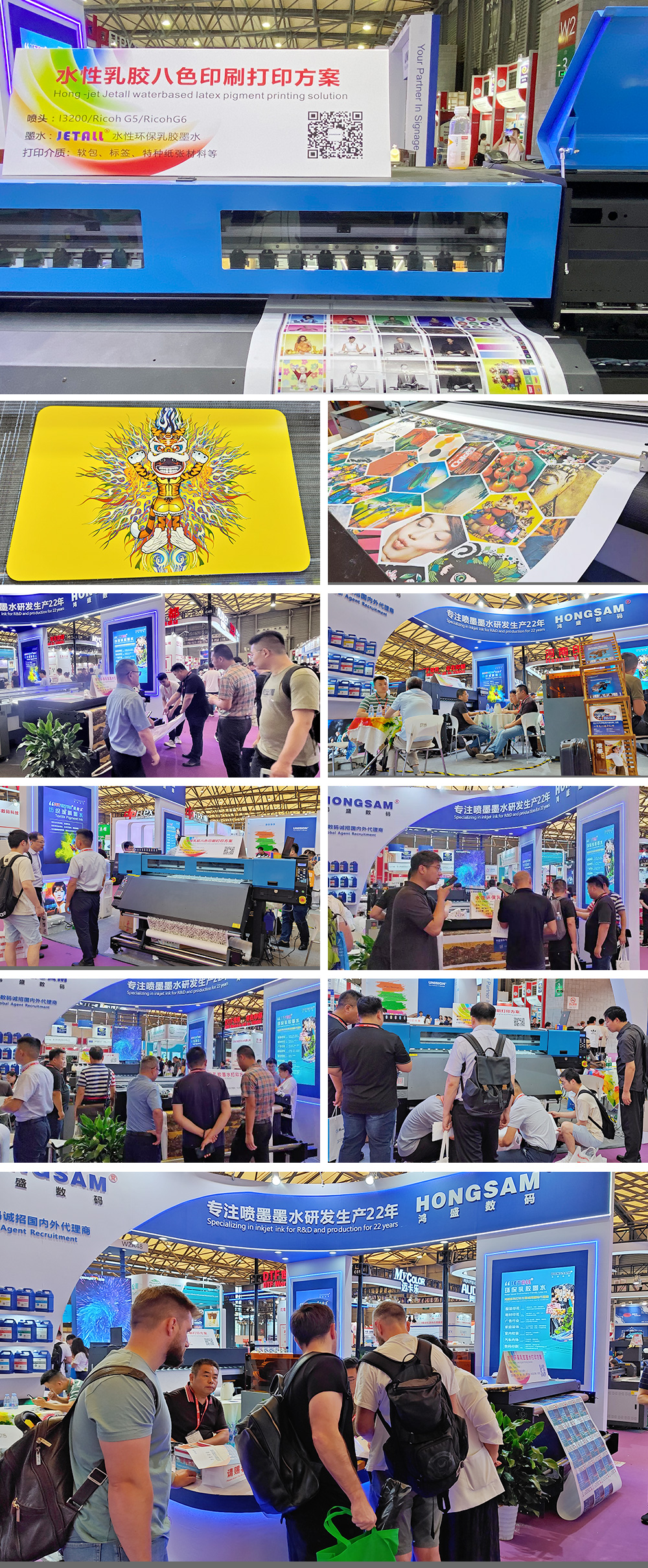 本次上海國際廣告展匯聚了全球的廣告行業精英,共同探討廣告領域的最新技術和產品。鴻盛數碼展示的JETALL®水性環保乳膠墨水打印方案吸引了眾多觀眾駐足參觀,現場演示了金屬、皮革、杜邦紙等不同材質的打印方案,通過現場演示,觀眾們直觀地感受到了JETALL®水性環保乳膠墨水出色的打印效果,紛紛對我們的產品贊不絕口。
