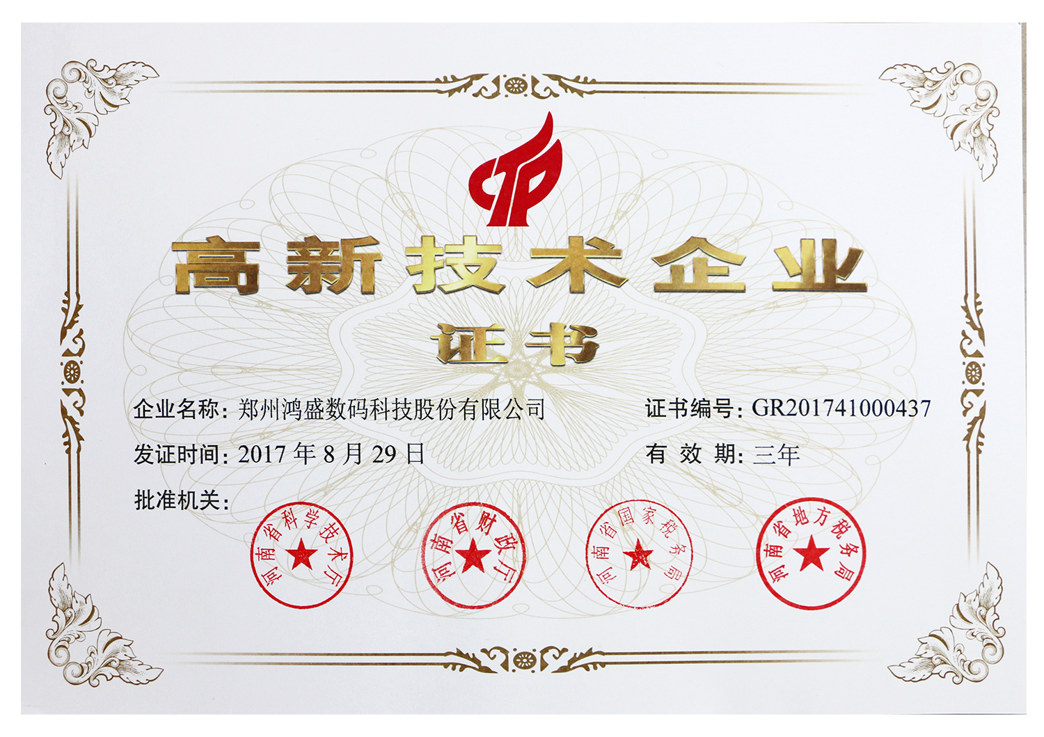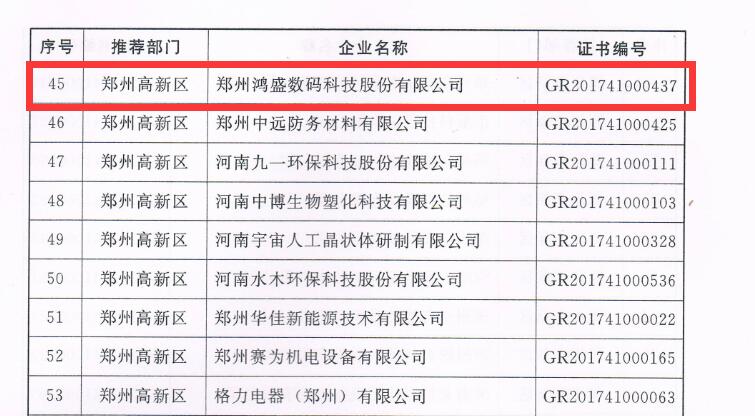 2017年 12月10日,鴻盛數(shù)碼從鄭州高新區(qū)領(lǐng)回了國(guó)家高新技術(shù)企業(yè)證書,這是鴻盛數(shù)碼第五次通過(guò)國(guó)家高新技術(shù)企業(yè)復(fù)審,至此,鴻盛數(shù)碼已連續(xù)13年保持國(guó)家高新技術(shù)企業(yè)資格。