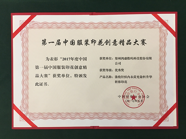 “首屆中國服裝印花創(chuàng)意精品大賽”頒獎儀式于2017年5月22日在廣州舉行,鴻盛數(shù)碼參賽面料“滌綸針織內(nèi)衣熒光升華轉(zhuǎn)移印花”獲本次大賽優(yōu)秀獎。