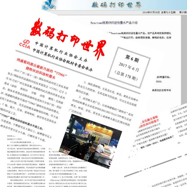 2017年5月26日的廣州紡織品數碼印花工業展上鴻盛數碼發布了新升級的“Y706A”捷特絲紡織涂料墨水,新款的紡織涂料墨水無論在色彩和應用范圍上都有重大突破備受媒體關注,數碼打印世界、印花社、趨勢印花以及數碼紡織等媒體紛紛進行了宣傳報道,更有眾多網絡媒體進行了轉載,在行業內引起了不小的反響。