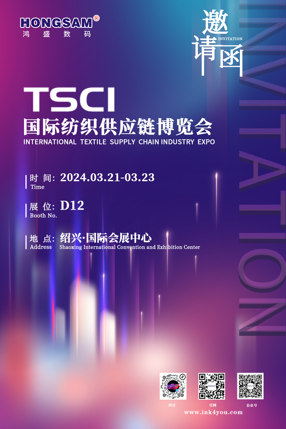 TSCI 2024(第七屆)國際紡織供應鏈工業博覽會將于2024年3月21日-23日在紹興·國際會展中心盛大開展,屆時,鴻盛數碼(展位號:D12)將攜旗下紡織系列墨水及打印方案隆重亮相,敬請期待!