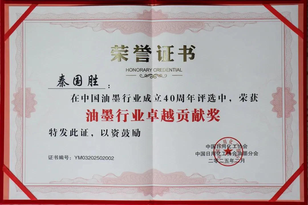 ?2025年2月,公司榮獲“油墨行業可持續發展企業”,公司董事長秦國勝先生榮獲“油墨行業卓越貢獻獎”。